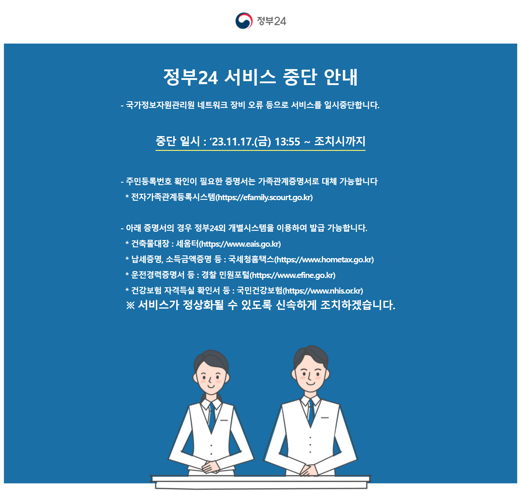 23년 11월 17일 오늘 오후 2시쯤부터 급작스럽게 정부24 홈페이지를 포함한 민원 서비스를 중단한다고 합니다.