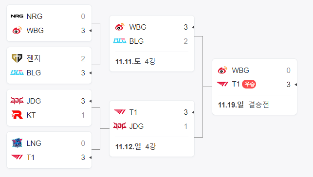롤 월드챔피언십 대진표로 T1은 LNG와 JDG를 꺾고 마지막 WBG까지 꺾으면서 우승을 차지했습니다.