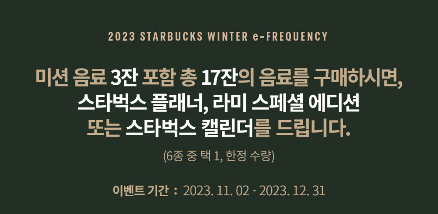 2023 스타벅스 윈터 e-Frequency 이벤트는 미션 음료 3잔을 포함하여 총 17잔의 음료를 마시면