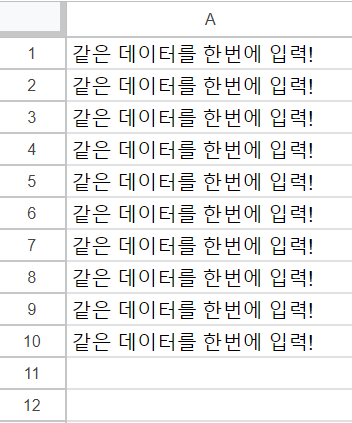 activeSheet.getRange(1, 1, 10).setValue("같은 데이터를 한번에 입력!");