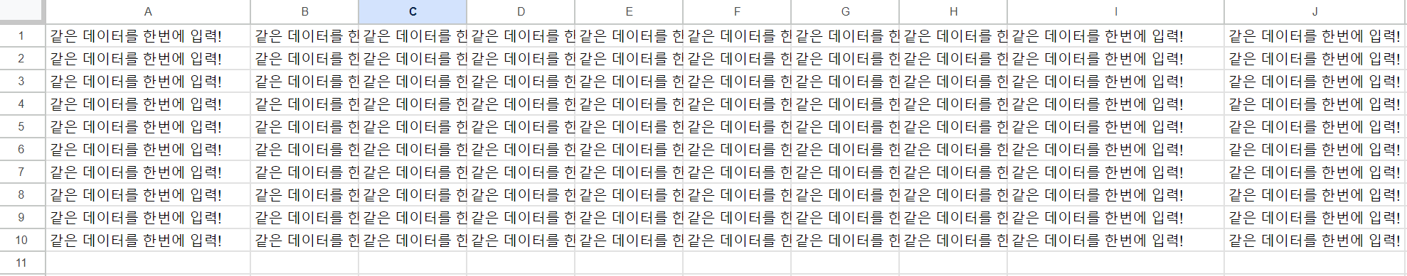 activeSheet.getRange(1, 1, 10, 10).setValue("같은 데이터를 한번에 입력!");