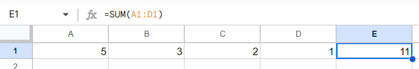 spreadsheet.getRange('E1').setFormulaR1C1("=SUM(A1:D1)");