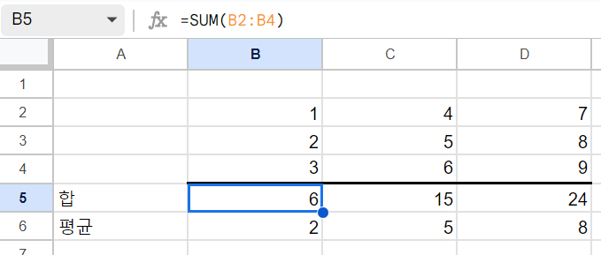 위 스크립트를 이용하여 B5:D6 범위의 각각의 셀에 해당 합과 평균 함수들을 설정하였습니다.