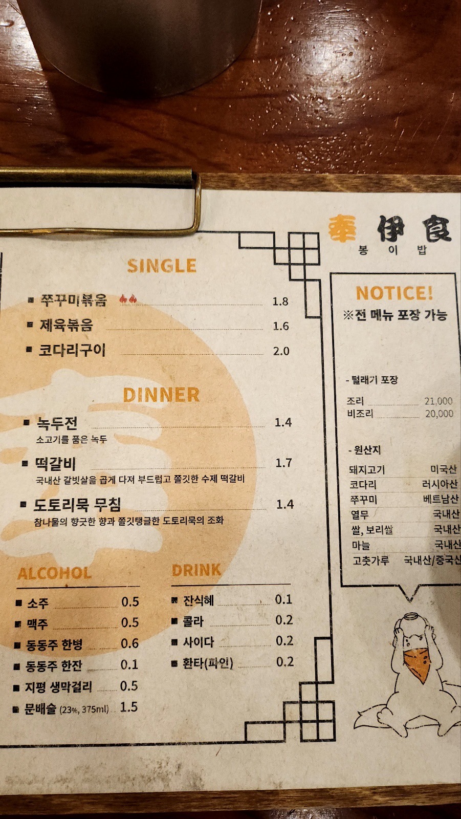 봉이밥 메뉴판이랍니다.