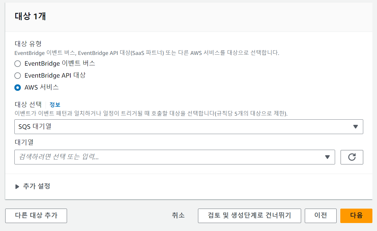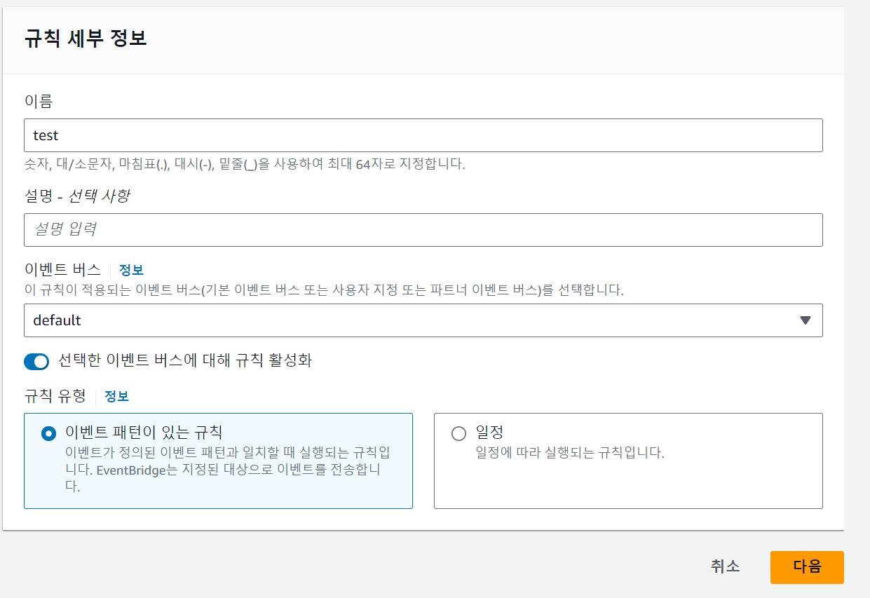 이름과 설명, 이벤트 버스 설정을하고 이벤트 패턴이 있는 규칙을 설정하고 다음을 누릅니다.