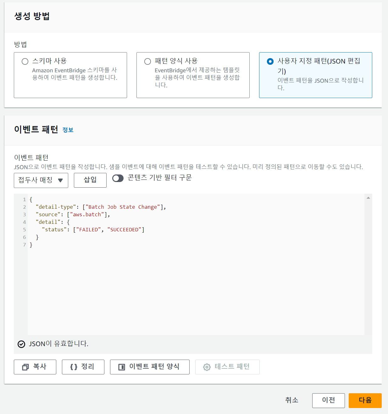 이벤트 패턴에서 위와 같이 JSON을 입력합니다.