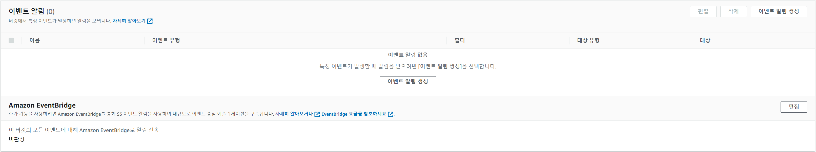우선 S3 버킷을 하나 만들고 '속성' 탭으로 가면 이벤트 알림이라고 있다.