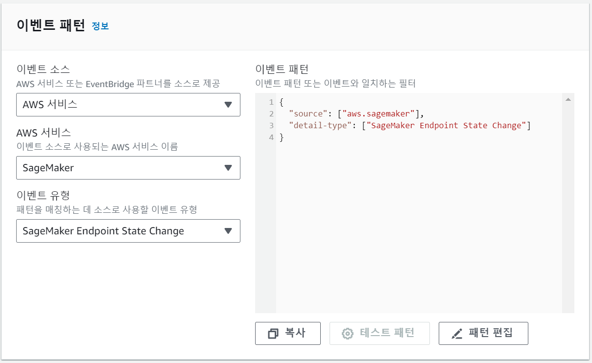 이벤트 패턴에서 유형을 SageMaker Endpoint State Change라는 부분을 찾을 수 있었습니다.
